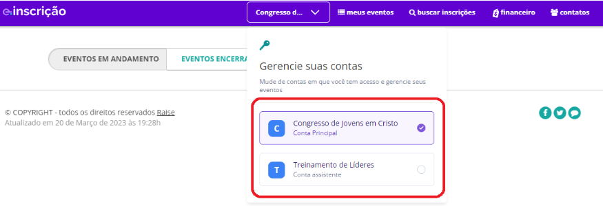 Se você é organizador de uma conta e assistente em outra, ou é assistente em mais de uma conta, para ter acesso às duas com um único clique, siga esses passos: