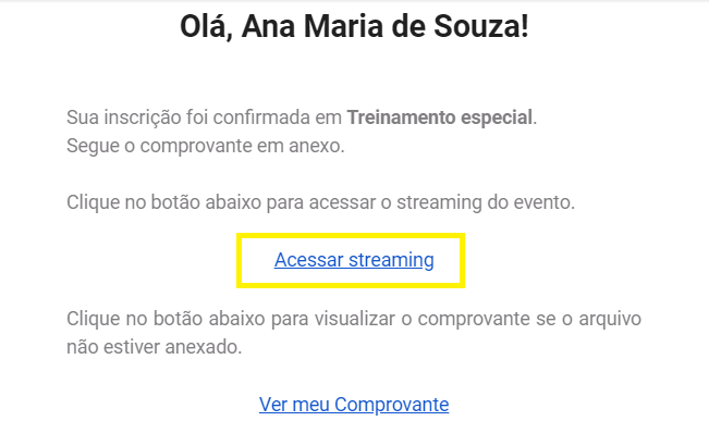 1.1. Ao realizar o pagamento da sua inscrição, você receberá um e-mail de confirmação da sua inscrição. Nesse e-mail haverá o botão de Acessar Streaming. É só clicar e pronto, você será encaminhado ao evento.