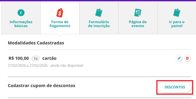 Atenção: o valor de desconto definido será aplicado a cada inscrição individualmente, e não ao valor total do carrinho.