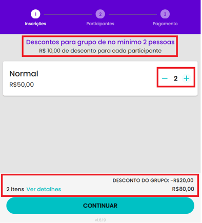 Após a configuração, o desconto será aplicado automaticamente no checkout, assim que o número mínimo de inscrições for atingido, conforme o exemplo abaixo.