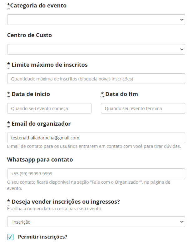 - Lembre-se de marcar o evento como gratuito e deixe marcada também a opção de Permitir Inscrições", que pode ser desmarcada a qualquer momento, pausando o recebimento de novas inscrições, mesmo que o limite máximo de inscritos não tenha sido atingido ainda.