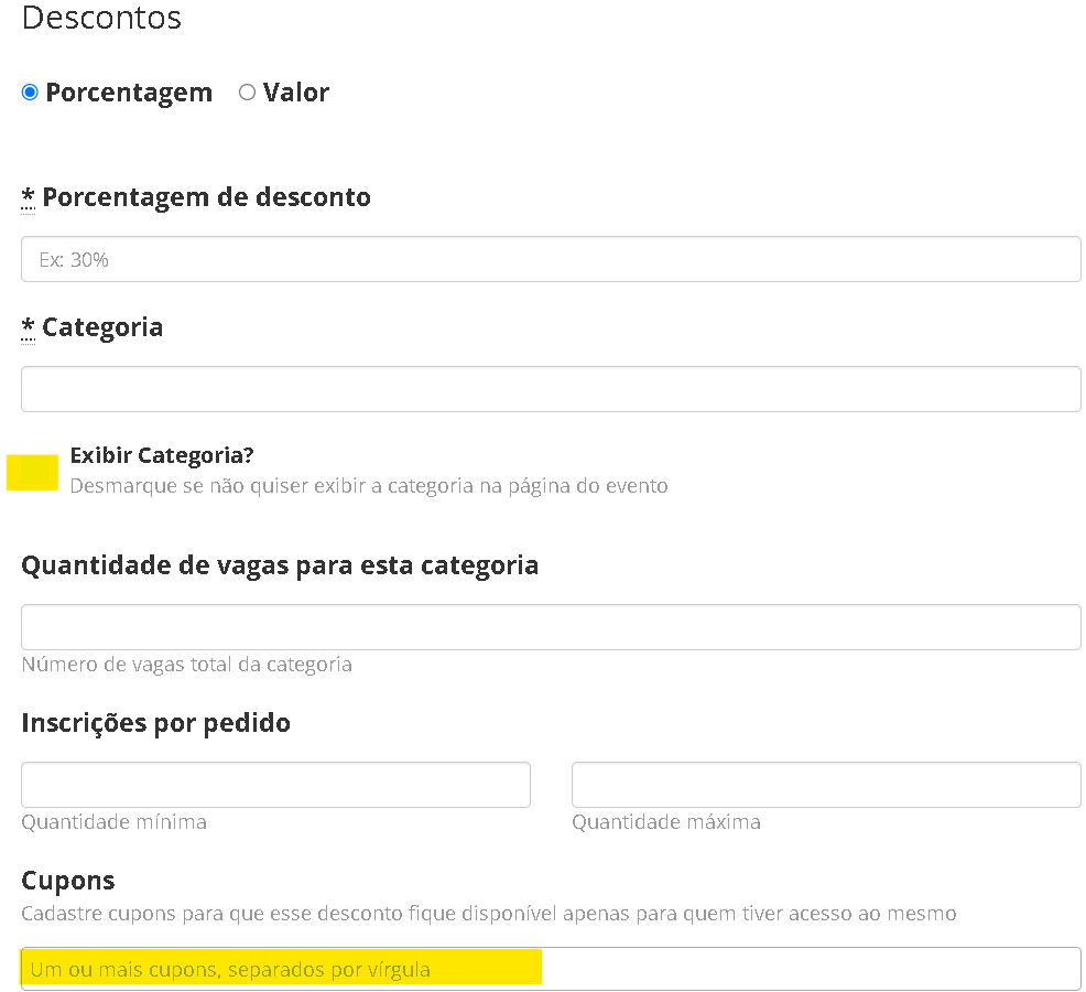 DICA: Caso queira criar uma categoria oculta (muito utilizada para ingressos/inscrições cortesia), defina o desconto, deixe a caixa de seleção da opção Exibir Categoria sem marcação, e cadastre um cupom.