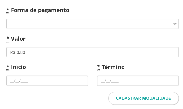 Dica: Se você deseja que o mesmo lote aceite diferentes formas de pagamento (ex: Cartão e PIX), você deve repetir o processo acima para cada modalidade, mantendo o mesmo valor e o mesmo período de vigência.