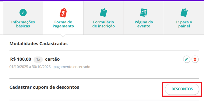 3.1 Na listagem de modalidades cadastradas, clique no botão Descontos.