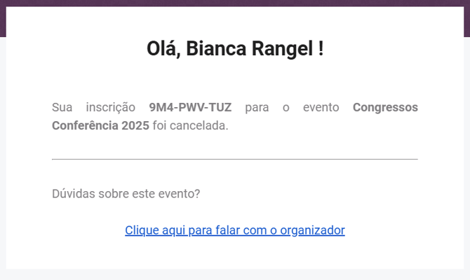 ⚠️ Ao ter sua inscrição cancelada, o participante recebe um comunicado em seu e-mail, conforme o do modelo abaixo: