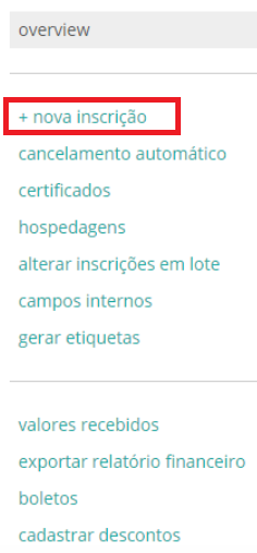2. Do lado esquerdo do painel, clique em + nova inscrição > Preencha os dados do inscrito > Continuar.