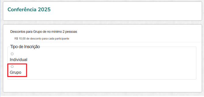 3. Selecione a opção Grupo > Preencha os dados do 1º inscrito > clique em Continuar.