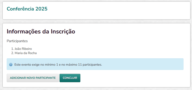 Se a configuração do seu evento permitir inserir mais de uma inscrição em um mesmo carrinho, também será possível adicionar mais de uma inscrição no mesmo processo de forma interna.