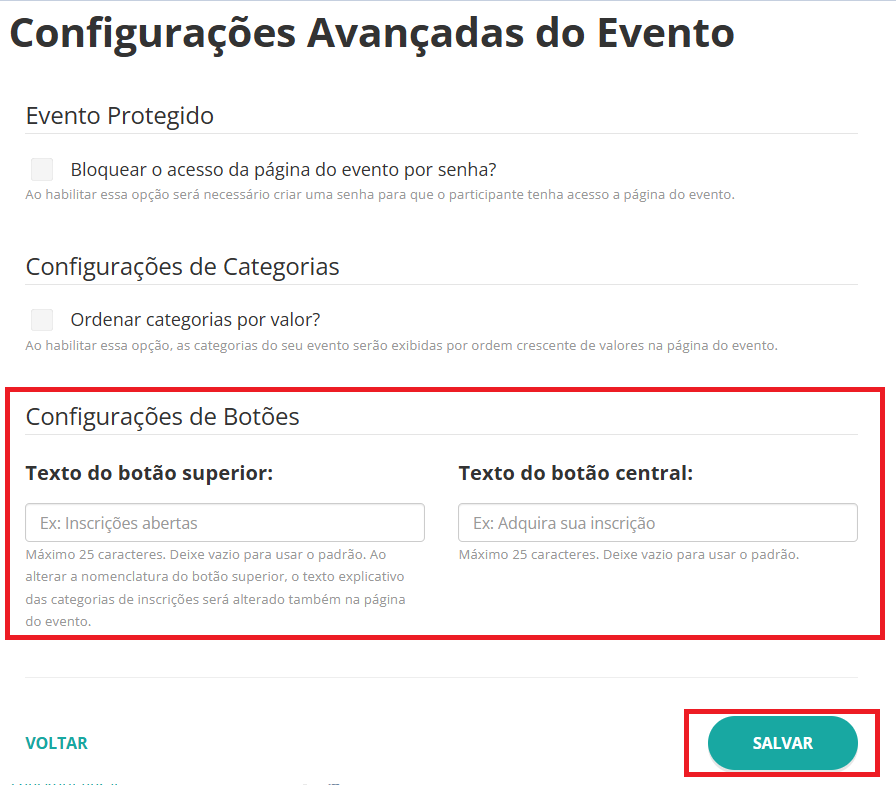 Agora você pode personalizar os textos dos botões principais da página pública do seu evento, deixando sua comunicação mais alinhada com o propósito, o estilo e a estratégia da sua organização.