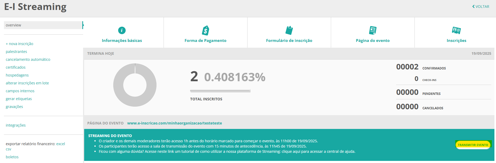- O acesso à sala de transmissão ficará disponível na dashboard do evento assim que a configuração for finalizada.