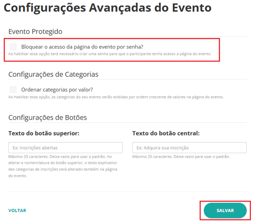 3. Ative a opção “Bloquear o acesso da página do evento por senha?”