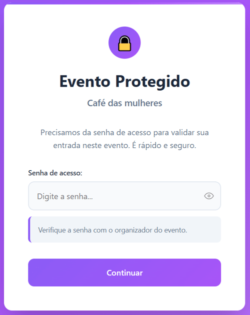 Essa senha é definida por você, organizador, e funciona como um bloqueio antes do carregamento da página. Ou seja, sem a senha correta, o conteúdo do evento não é exibido.