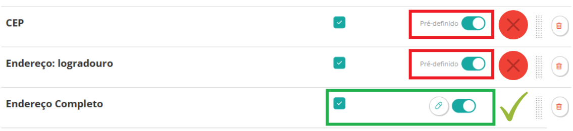 - Criar campos de texto que façam referência ao endereço, como preferir (cidade, estado, logradouro..), e selecionar obrigatoriedade para preenchimento desses campos. Nesse caso, não utilize campos de endereço pré-definidos, crie campos de texto.